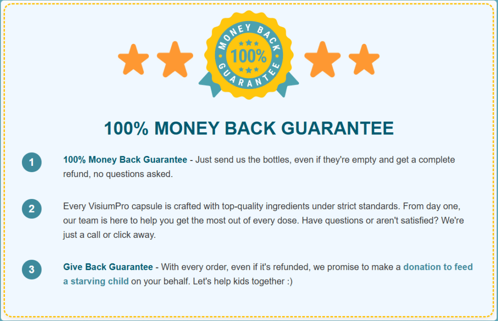 Every single Visium Pro supplement purchase is backed with a 180-day 100% money-back guarantee. So if you are not impressed with the results, you can simply choose this refund policy for getting your complete money back. Even though the Visium Pro formula is made using natural ingredients its effect on individuals may vary. If you have used the supplement for the suggested period of time and didn’t get the expected results then the refund policy is yours to claim.
